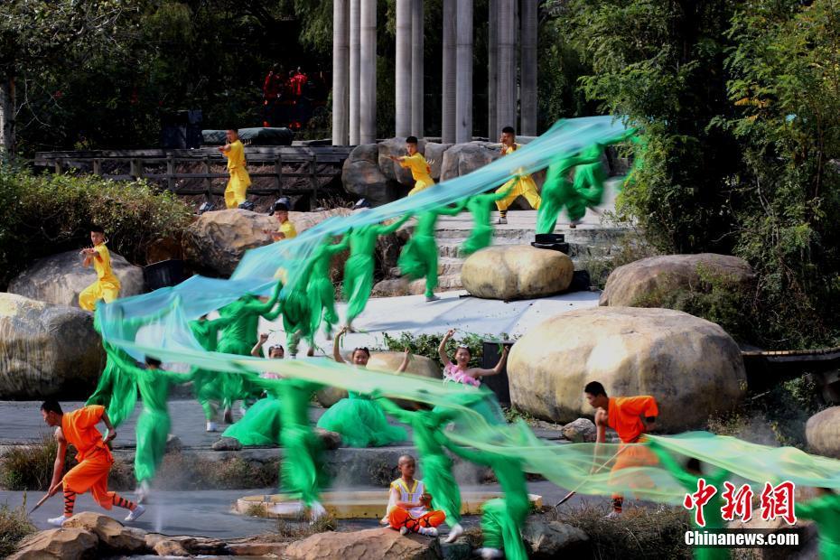 10月19日,河南登封,参演人员参与开幕式彩排预演。第十二届中国郑州国际少林武术节将于10月20日在禅宗少林音乐大典实景地举行本届武术节开幕式。 中新社记者 王中举 摄