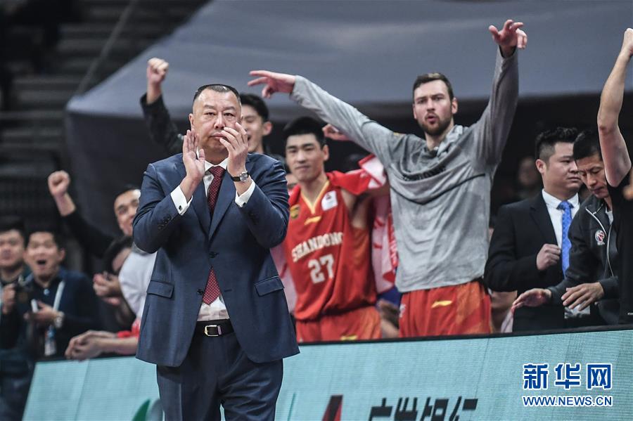 ↑10月21日,山东西王队主教练吴庆龙(前)在场边给队员鼓劲。 当日,在2018-2019赛季中国男子篮球职业联赛(CBA)常规赛首轮比赛中,辽宁本钢队主场对阵山东西王队。 新华社记者潘昱龙摄