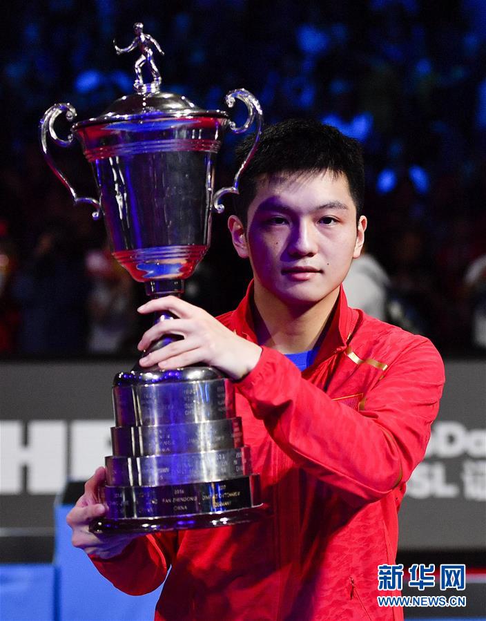 10月21日,樊振东在颁奖仪式上。 当日,在法国巴黎近郊谢西举行的2018年乒乓球男子世界杯决赛中,中国选手樊振东以4比1战胜德国选手波尔,夺得冠军。 新华社记者陈益宸摄