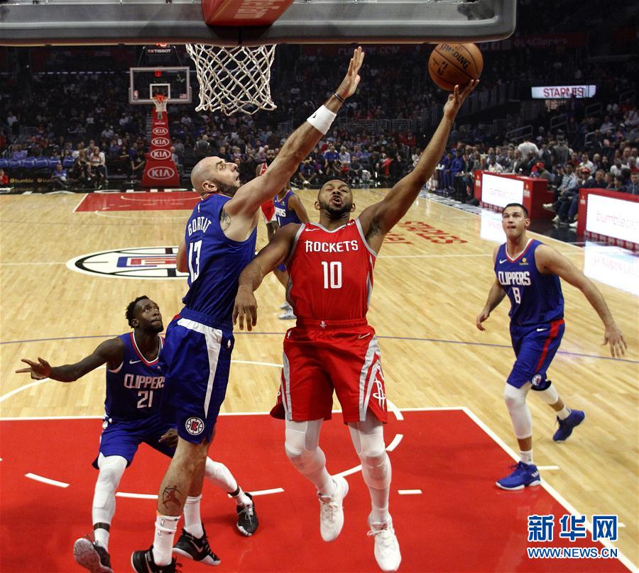 10月21日,火箭队球员戈登(右二)在比赛中突破上篮。 当日,在2018-2019赛季NBA常规赛中,洛杉矶快船队主场以115比112战胜休斯敦火箭队。 新华社发(赵汉荣摄)