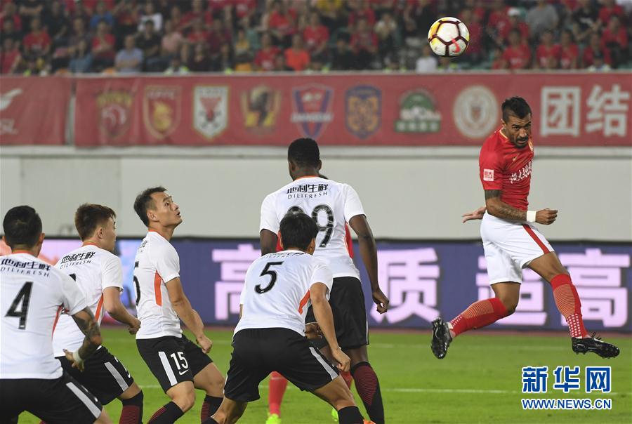 图为广州恒大淘宝队球员保利尼奥(右)在比赛中头球传中。 新华社记者邓华摄