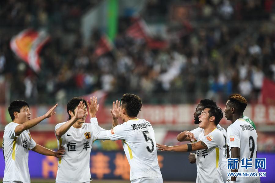 图为10月20日,贵州恒丰队球员林隆昌(左三)进球后和队友庆祝。 新华社记者陶亮摄