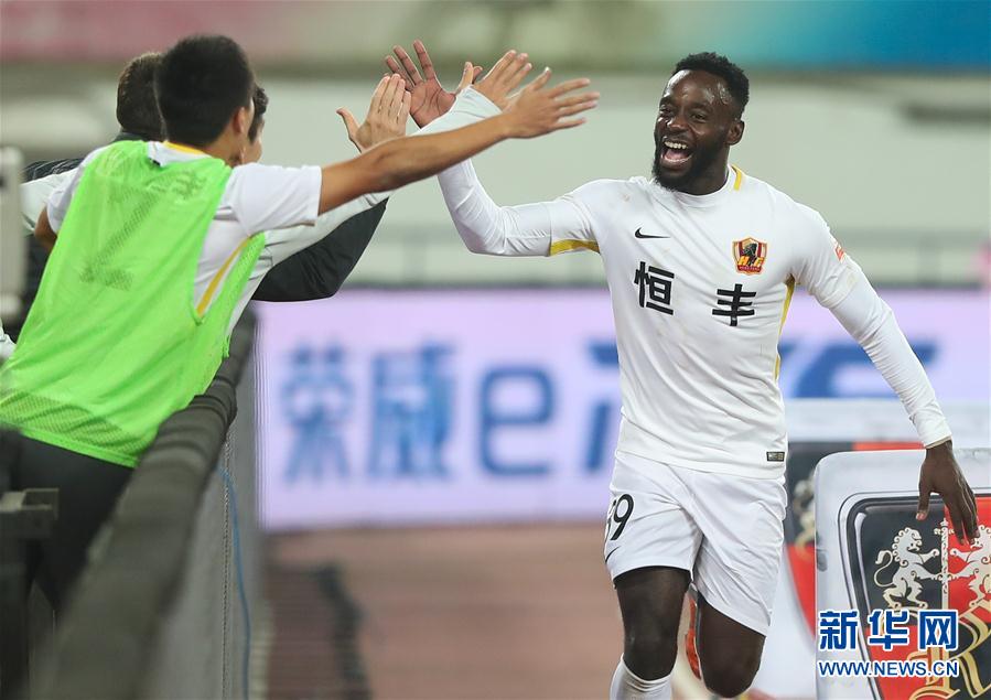 图为10月20日,贵州恒丰队球员博利(右)在进球后庆祝。 新华社记者刘续摄