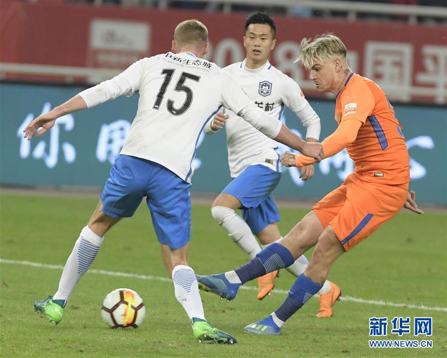 图为10月20日,山东鲁能泰山队球员格德斯(右)在比赛中射门。 新华社发(崔健摄)