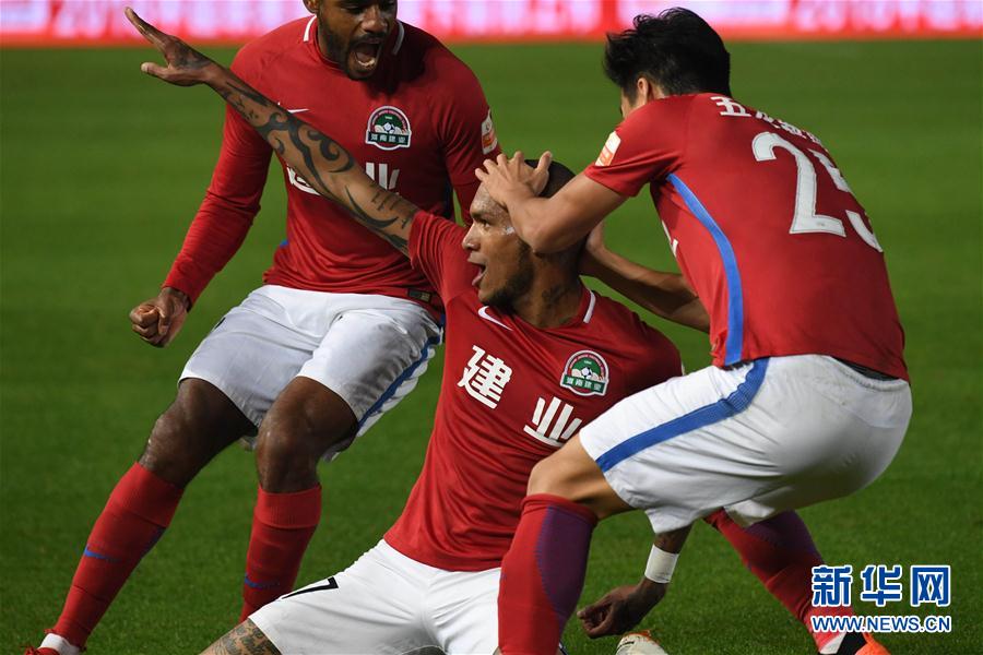 图为10月21日,河南建业队球员卡兰加(中)在比赛中庆祝进球。 新华社记者李安摄
