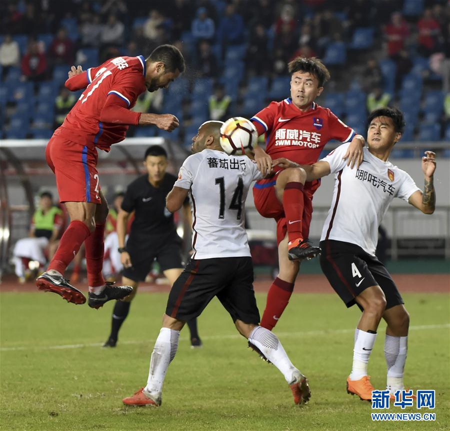图为重庆斯威队球员卡尔德克(左一)头球攻门。 新华社记者唐奕摄