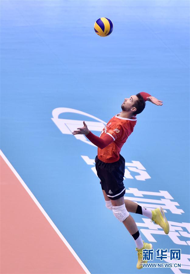 10月22日,北京汽车男排队球员凯文·蒂略在比赛中发球。 当日,在2018-2019赛季中国男排超级联赛第一阶段分组赛B组第一轮比赛中,北京汽车男排队以3比0战胜四川男排队。 新华社记者姚剑锋摄