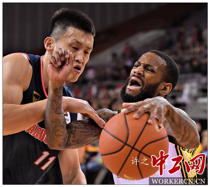 2018年10月23日晚,CBA常规赛第二轮,广东队继续客场挑战北京北控农商行队,广东队在首节落后17分的情况下,上演绝地反击,最终以131比109反客为主逆转战胜北京北控队,取得两连胜。全场阿联取得29分14篮板5盖帽,周鹏24分4篮板5助攻。工人日报-中工网记者许之丰摄影报道