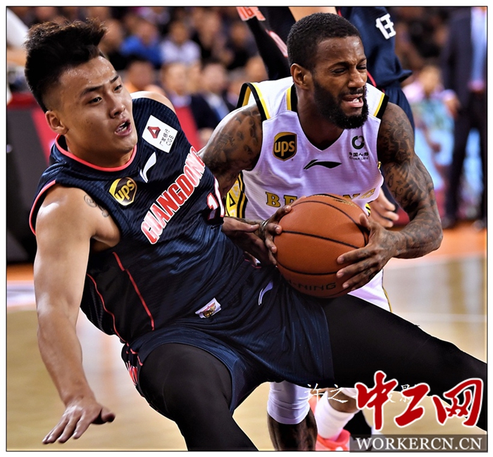 2018年10月23日晚,CBA常规赛第二轮,广东队继续客场挑战北京北控农商行队,广东队在首节落后17分的情况下,上演绝地反击,最终以131比109反客为主逆转战胜北京北控队,取得两连胜。全场阿联取得29分14篮板5盖帽,周鹏24分4篮板5助攻。工人日报-中工网记者许之丰摄影报道