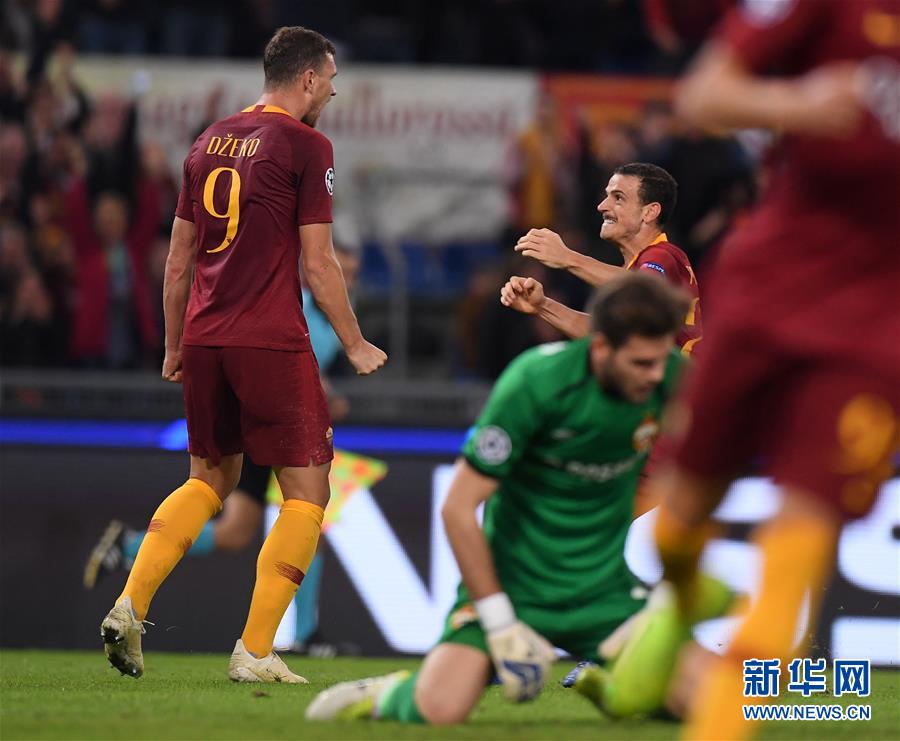 10月23日,罗马队球员哲科(左)和队友庆祝进球。 当日,在2018-2019赛季欧冠联赛G组第三轮比赛中,意甲罗马队主场以3比0战胜俄超莫斯科中央陆军队。 新华社发(阿尔贝托·林格里亚摄)