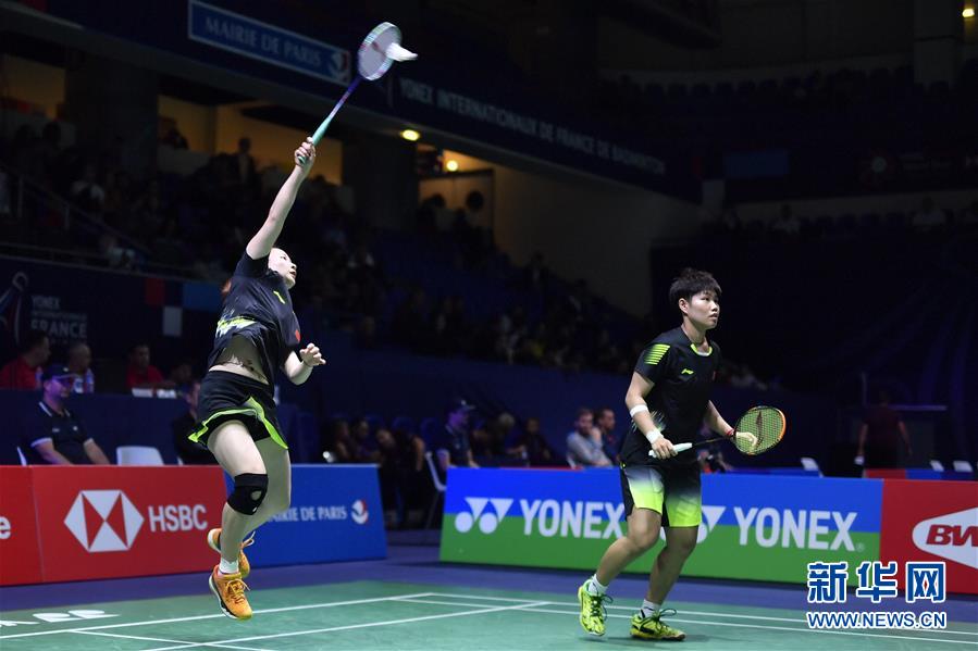 10月24日,黄东萍/黄雅琼(左)在比赛中。 当日,在法国巴黎顾拜旦体育馆举行的2018国际羽联世界巡回赛法国公开赛女子双打首轮比赛中,中国组合黄东萍/黄雅琼以0比2不敌日本组合福岛由纪/广田彩花,无缘第二轮。 新华社记者陈益宸摄