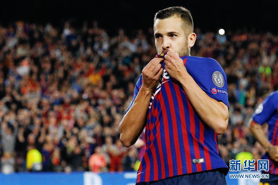 10月24日,巴塞罗那队球员阿尔巴在比赛中庆祝进球。 当日,在2018-2019赛季欧冠联赛B组第三轮比赛中,西甲巴塞罗那队主场以2比0战胜意甲国际米兰队。 新华社发(胡安·戈萨摄)