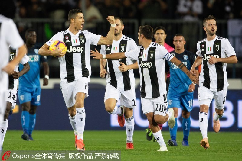 人民网北京10月28日电(管若寒)北京时间10月28日凌晨,意甲第10轮尤文图斯客场迎战恩波利。基耶利尼赛前热身受伤,卡普托首开纪录。下半场,迪巴拉制造点球,C罗主罚扳平,此后轰进世界波,梅开二度,助尤文2-1逆转战胜恩波利。