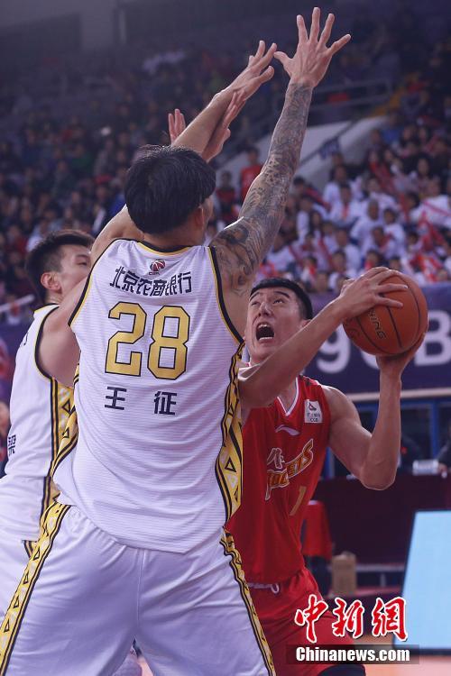 10月28日, 在2018-2019赛季中国男子篮球职业联赛(CBA)第四轮比赛中,北京农商银行队主场110比115负于八一南昌队。图为八一南昌队球员在比赛中遭遇北京农商银行队的阻拦。中新社记者 韩海丹 摄