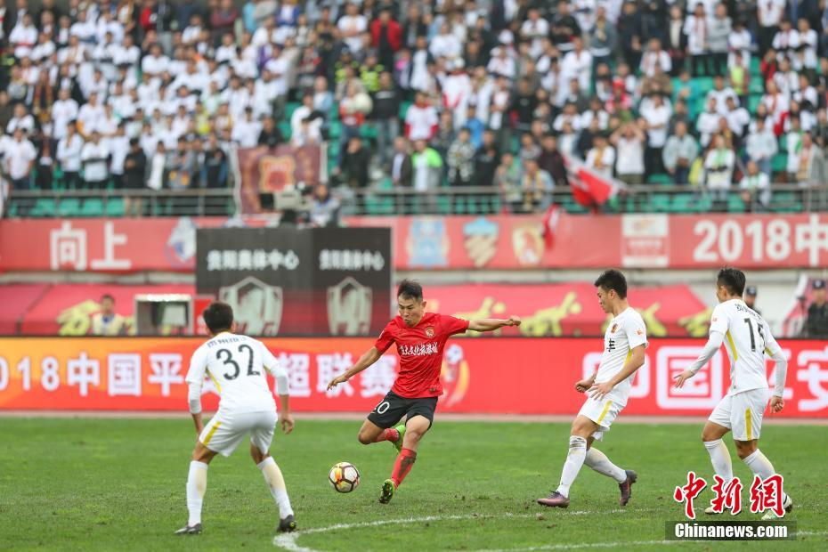 10月28日,2018中国足球超级联赛第27轮,贵州恒丰队主场0比3不敌广州恒大淘宝队。图为恒大球员射门瞬间。中新社记者 贺俊怡 摄