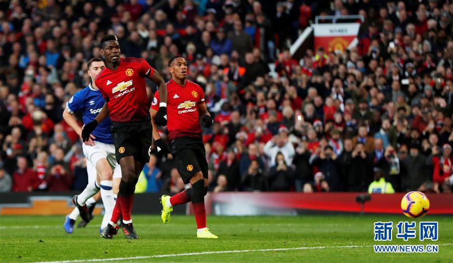 ↑10月28日,曼联队球员博格巴(前)在比赛中进球。 当日,在2018/2019赛季英格兰足球超级联赛第10轮比赛中,曼彻斯特联队主场以2比1战胜埃弗顿队。 新华社/路透