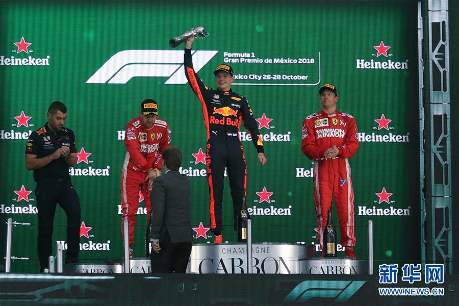 ↑10月28日,红牛车队荷兰车手维斯塔潘(右二)、法拉利车队德国车手维泰尔(左二)与法拉利车队芬兰车手莱科宁(右一)在颁奖仪式上。 当日,2018赛季世界一级方程式赛车锦标赛(F1)墨西哥大奖赛在墨西哥城结束争夺,红牛车队荷兰车手维斯塔潘夺得冠军,法拉利车队德国车手维泰尔与法拉利车队芬兰车手莱科宁分获亚军和季军。 新华社记者辛悦卫摄