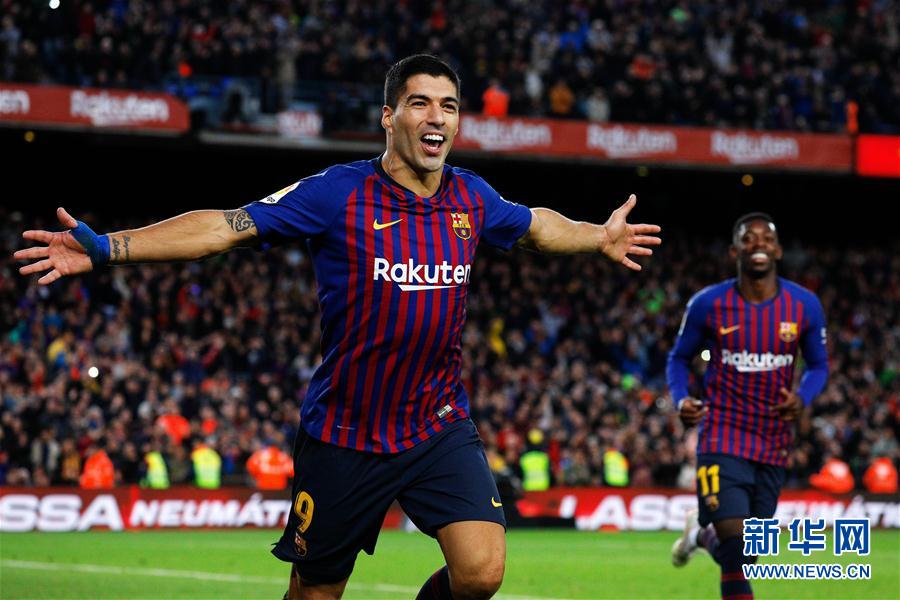 ↑10月28日,巴塞罗那队球员苏亚雷斯(左)庆祝进球。 当日,在2018-2019赛季西班牙足球甲级联赛第10轮比赛中,巴塞罗那队主场以5比1战胜皇家马德里队。 新华社发(胡安·戈萨摄)