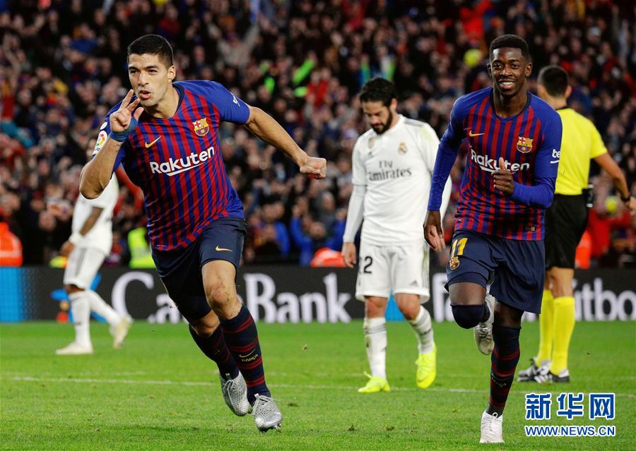 ↑10月28日,巴塞罗那队球员苏亚雷斯(左)庆祝进球。 当日,在2018-2019赛季西班牙足球甲级联赛第10轮比赛中,巴塞罗那队主场以5比1战胜皇家马德里队。 新华社发(胡安·戈萨摄)