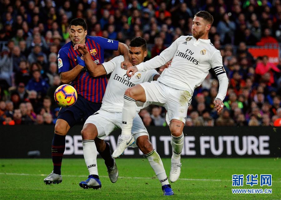 ↑10月28日,巴塞罗那队球员苏亚雷斯(左)与皇家马德里队球员拉莫斯(右)、卡塞米罗在比赛中拼抢。 当日,在2018-2019赛季西班牙足球甲级联赛第10轮比赛中,巴塞罗那队主场以5比1战胜皇家马德里队。 新华社发(胡安·戈萨摄)