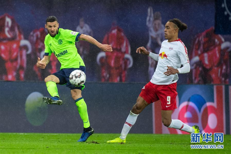 ↑10月28日,沙尔克04队球员卡利朱里(左)在莱比锡队球员波尔森的防守下传球。 当日,在2018-2019赛季德国足球甲级联赛第9轮比赛中,莱比锡队主场以0比0战平沙尔克04队。 新华社发(凯文·福格特摄)