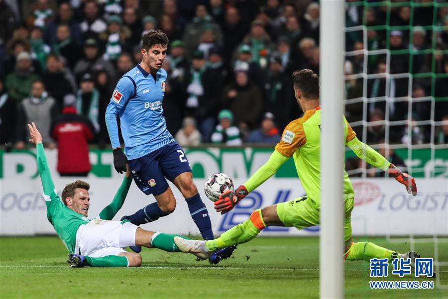 ↑10月28日,勒沃库森队球员哈弗茨(中)在比赛中射门得分。 当日,在2018-2019赛季德国足球甲级联赛第9轮比赛中,勒沃库森队客场以6比2战胜不来梅队。 新华社记者单宇琦摄