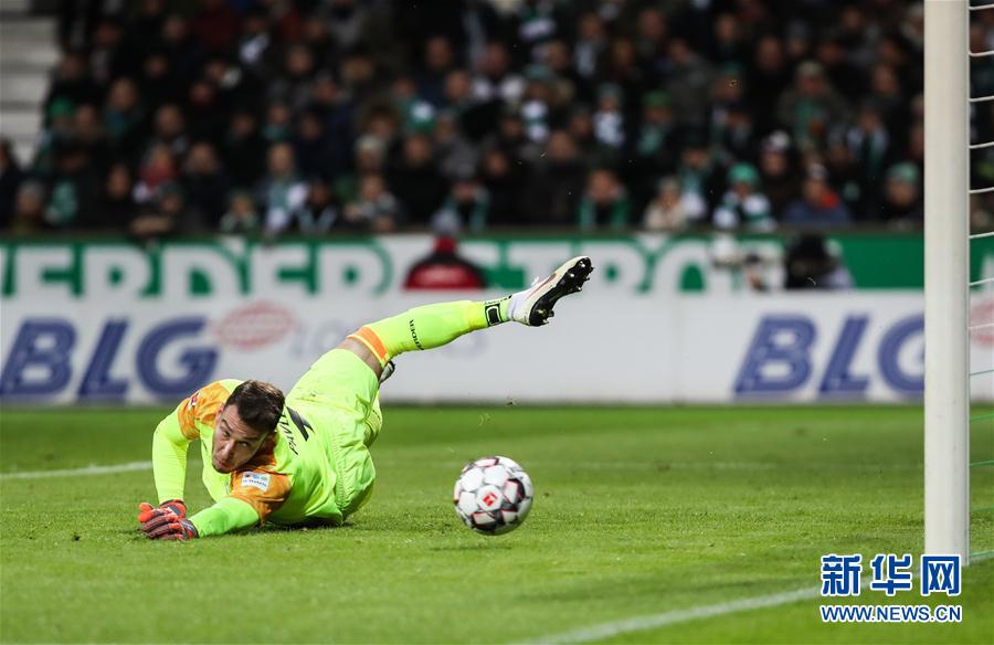↑10月28日,不来梅队守门员帕夫连卡在比赛中扑救。 当日,在2018-2019赛季德国足球甲级联赛第9轮比赛中,勒沃库森队客场以6比2战胜不来梅队。 新华社记者单宇琦摄