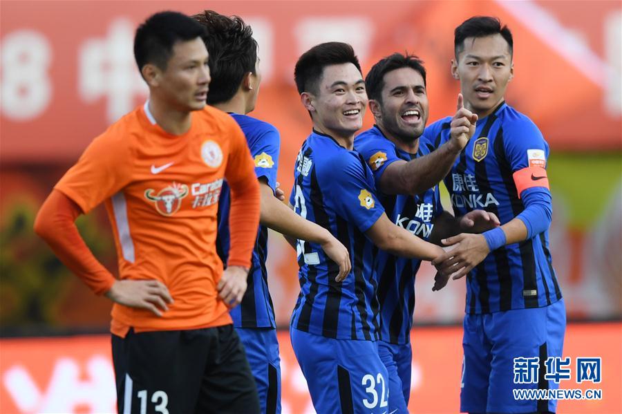 ↑10月28日晚,2018赛季中超联赛第27轮战罢。积分榜前两位的上海上港队和广州恒大队双双大胜对手,争冠悬念依旧。武磊本轮打进两球,中超进球数达到100个。而河南建业队的获胜则令保级形势更加复杂,目前积分榜第八位的球队也仅领先倒数第二的河南5分。目前除贵州21分稳坐“副班长”位置之外,建业、泰达、重庆均积28分,富力29分也岌岌可危,同积31分的权健和亚泰、32分的一方也还要继续为保级努力。即使是目前排名第八的北京人和队也仅领先建业等三队5分。最后三轮保级大战将异常惨烈,局面也将十分混乱。 北京人和 0-2 江苏苏宁 图为10月27日,江苏苏宁易购队球员埃德尔(右二)在进球后与队友吴曦(右一)、黄紫昌(右三)庆祝。 新华社记者鞠焕宗摄