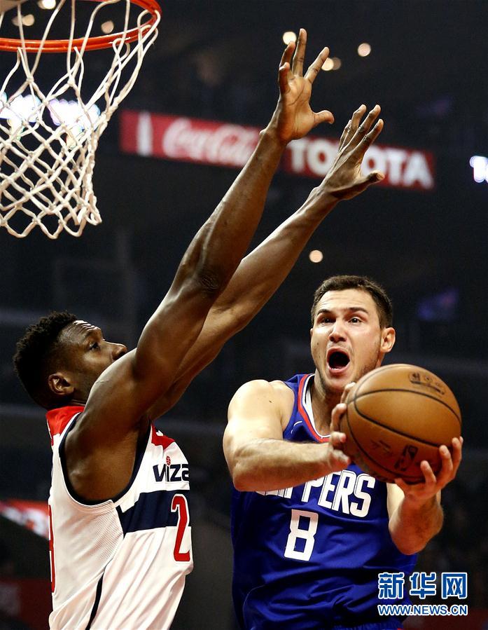 ↑10月28日,洛杉矶快船队球员达尼罗·加里纳利(右)在比赛中突破上篮。 当日,在2018-2019赛季NBA常规赛中,洛杉矶快船队主场以136比104战胜华盛顿奇才队。 新华社发(赵汉荣摄)