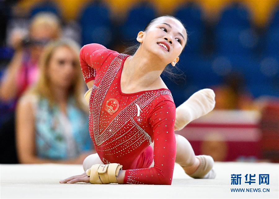 ↑10月28日,中国队选手陈一乐在自由操比赛中。 当日,在多哈举行的第48届世界体操锦标赛女子项目预赛中,由陈一乐、刘婷婷、刘津茹、罗欢和章瑾组成的中国队以165.196分的总成绩位列团体第三位,晋级决赛。 新华社发(尼库摄)