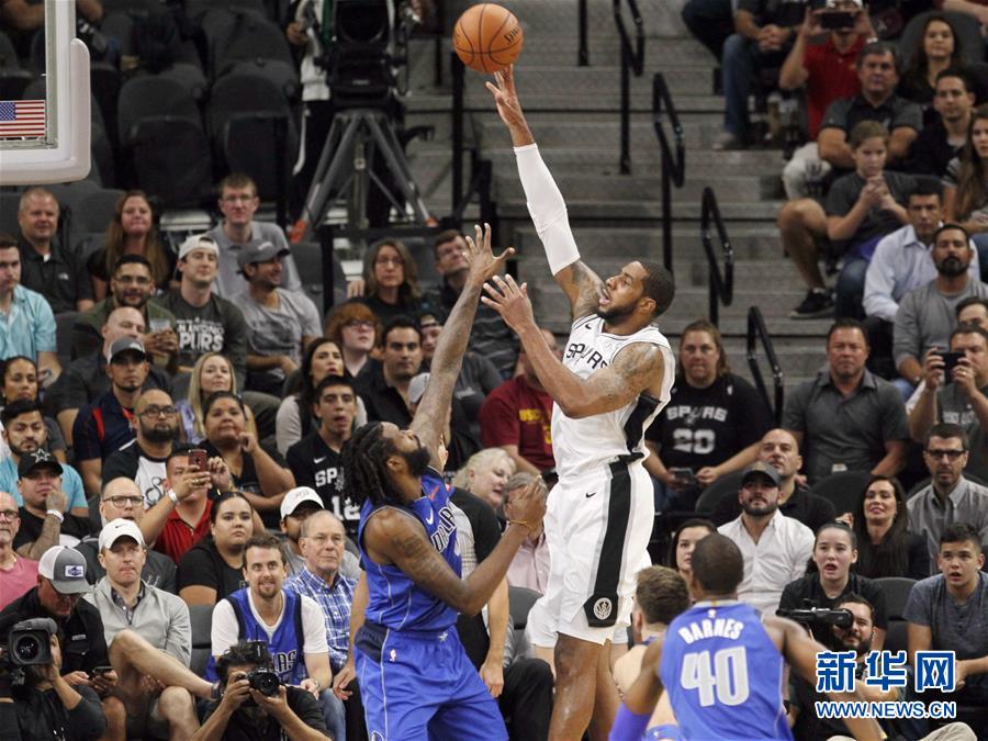 10月29日,马刺队球员阿尔德里奇(上)在比赛中投篮。 当日,在2018-2019赛季NBA常规赛中,圣安东尼奥马刺队主场通过加时以113比108战胜达拉斯独行侠队。 新华社发(宋穹摄)