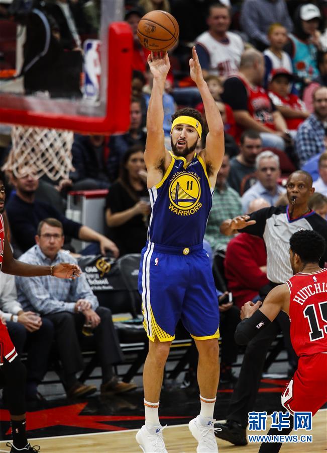 10月29日,勇士队球员克莱·汤普森(上)在比赛中投篮。 新华社发(乔尔·莱纳摄)