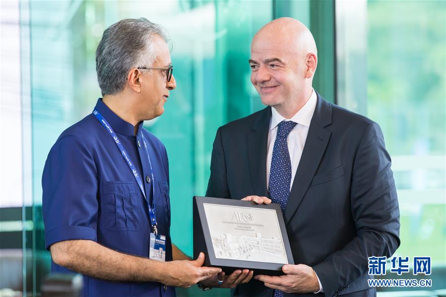 10月30日,国际足联主席因凡蒂诺(右)与亚足联主席萨尔曼在揭幕仪式上交谈。 新华社记者朱炜摄