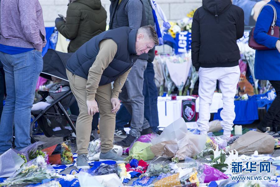 ↑10月29日,一名球迷献花后痛哭。 当日,莱斯特球迷来到莱斯特城俱乐部王权球场外,悼念因直升机坠毁丧生的俱乐部主席维猜。 新华社发(徐晖摄)