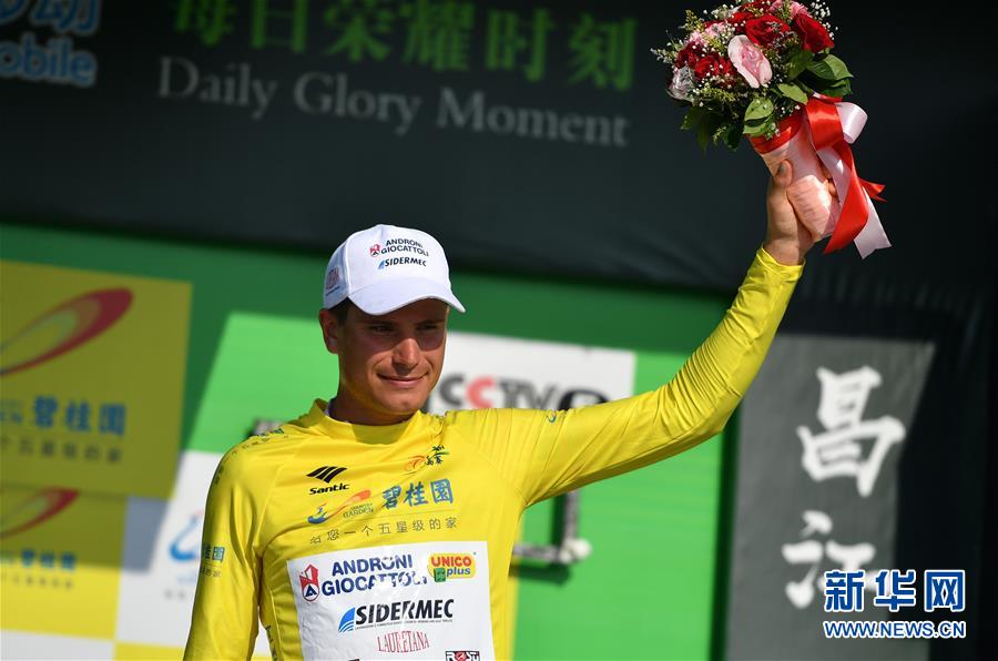 10月30日,身着黄色领骑衫的意大利安德罗尼车队车手福斯托·马斯纳达在颁奖台上庆祝。 当日,2018环海南岛国际公路自行车赛第八赛段从乐东到昌江的比赛结束,赛程197.2公里。 新华社记者郭程摄
