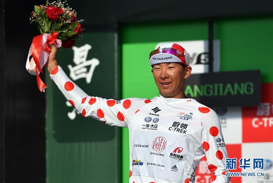10月30日,获得赛段爬坡王的中国恒翔洲际自行车队车手吕先景在颁奖台上身着圆点衫庆祝。 新华社记者郭程摄