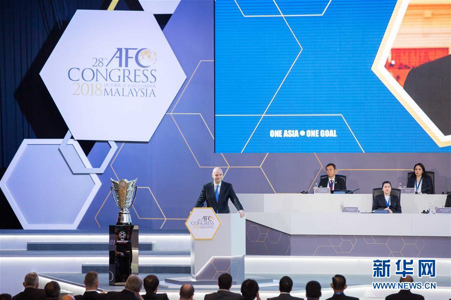 10月31日,国际足联主席因凡蒂诺(左)在马来西亚吉隆坡举行的亚足联代表大会上致辞。 当日,国际足联主席因凡蒂诺表示,国际足联依然正在研究2022年卡塔尔世界杯扩军到48支球队的可能性。 新华社记者 朱炜 摄