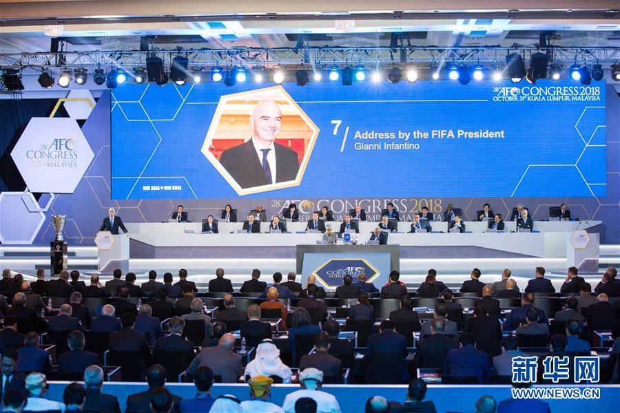 10月31日,国际足联主席因凡蒂诺(上左一)在马来西亚吉隆坡举行的亚足联代表大会上致辞。 当日,国际足联主席因凡蒂诺表示,国际足联依然正在研究2022年卡塔尔世界杯扩军到48支球队的可能性。 新华社记者 朱炜 摄