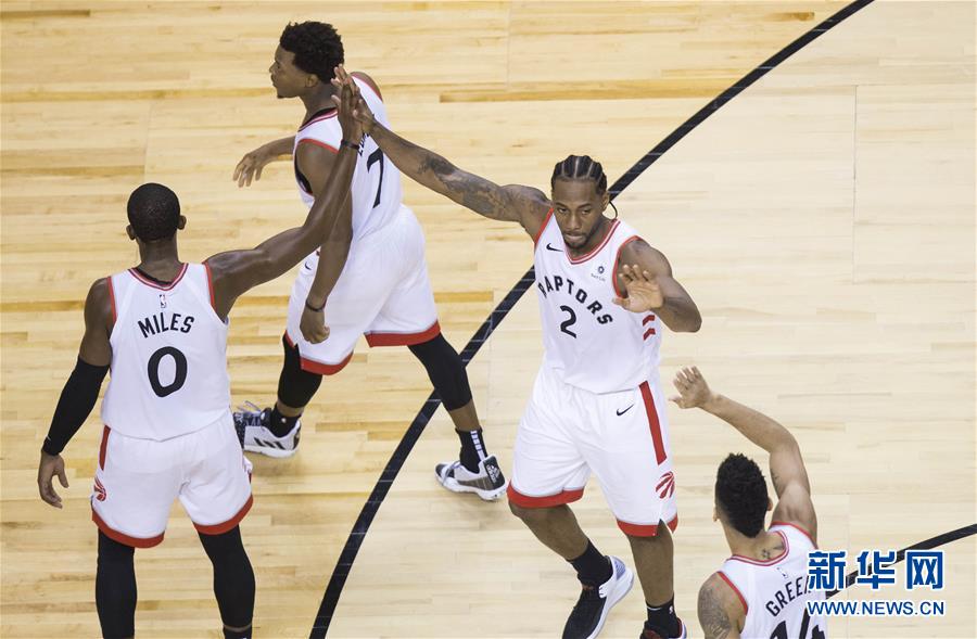 10月30日,猛龙队球员科怀·莱昂纳德(右二)与队友在比赛中庆祝得分。 当日,在2018-2019赛季NBA常规赛中,多伦多猛龙队主场以129比112战胜费城76人队。 新华社发(邹峥摄)