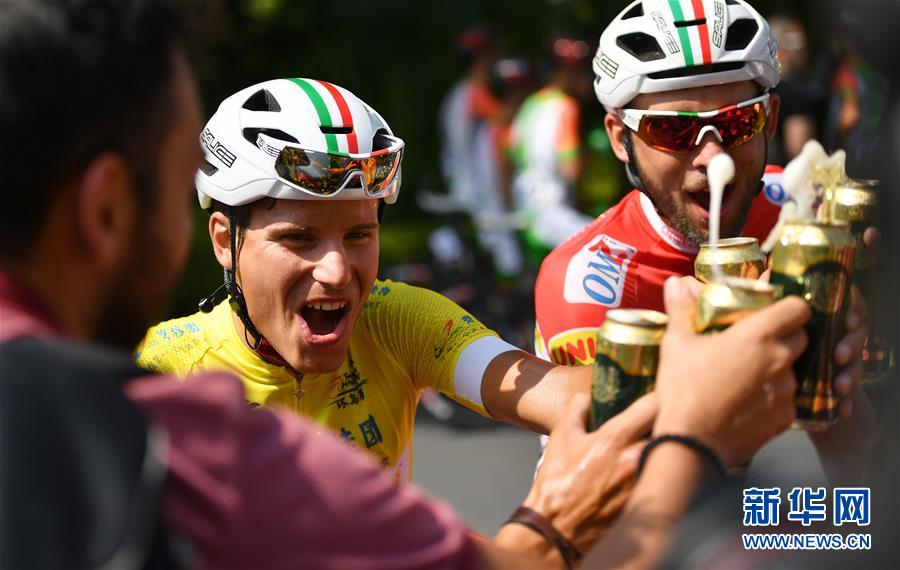 10月31日,获得个人成绩总冠军的意大利安德罗尼车队车手福斯托·马斯纳达(中)在赛后与队友庆祝。 新华社记者郭程摄