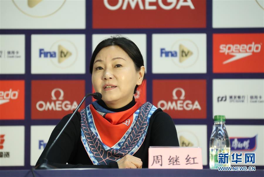 11月1日,中国游泳协会主席周继红在新闻发布会上发言。 新华社发(雒圆摄)