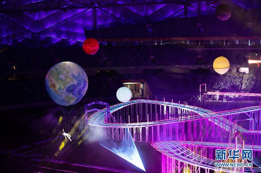 11月2日,开幕式上的文艺表演。 当日,首届世界无人机锦标赛开幕式在深圳大运中心举行。来自34个国家和地区的128名竞速无人机运动员参加开幕式。 新华社记者 周自扬 摄