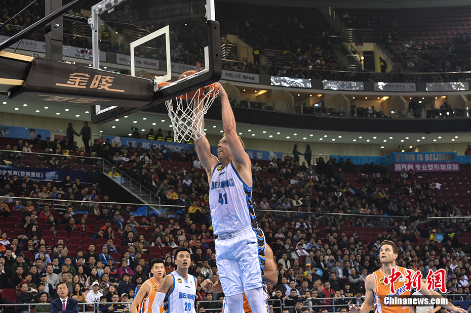 比赛最后阶段,双方86平进入暂停。暂停回来,汉密尔顿篮下轻松打成,刘炜借掩护突破内线上篮得手。弗雷戴特弧顶三分出手命中,汉密尔顿内线强打勾手打成,双方,94平。转换弗雷戴特底角后仰三分再中,北京队暂停,暂停回来刘炜杀到篮下强起打板上篮命中,最后时刻杰克逊倚着防守命中压哨高难度三分,双方战成100平进入加时。图为汉密尔顿扣篮。中新网记者 翟璐 摄