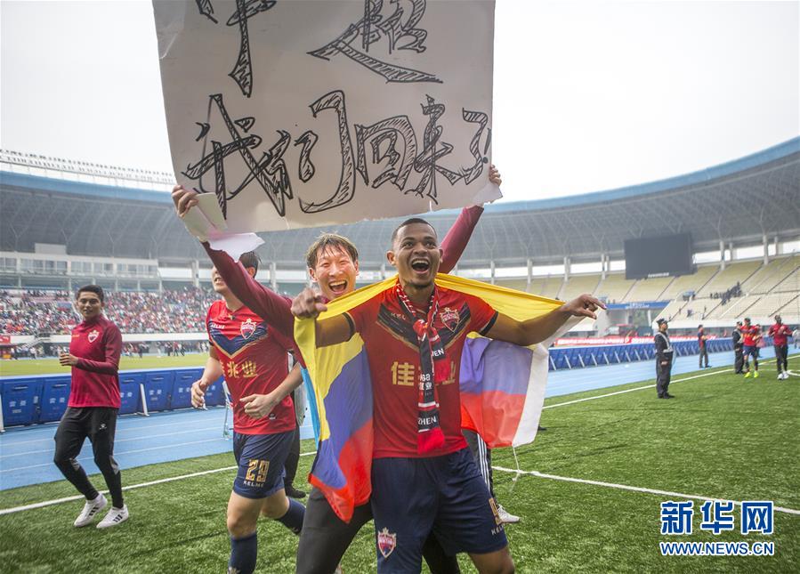 11月3日,深圳佳兆业队球员赛后庆祝冲超成功。 新华社发(赖犁摄)