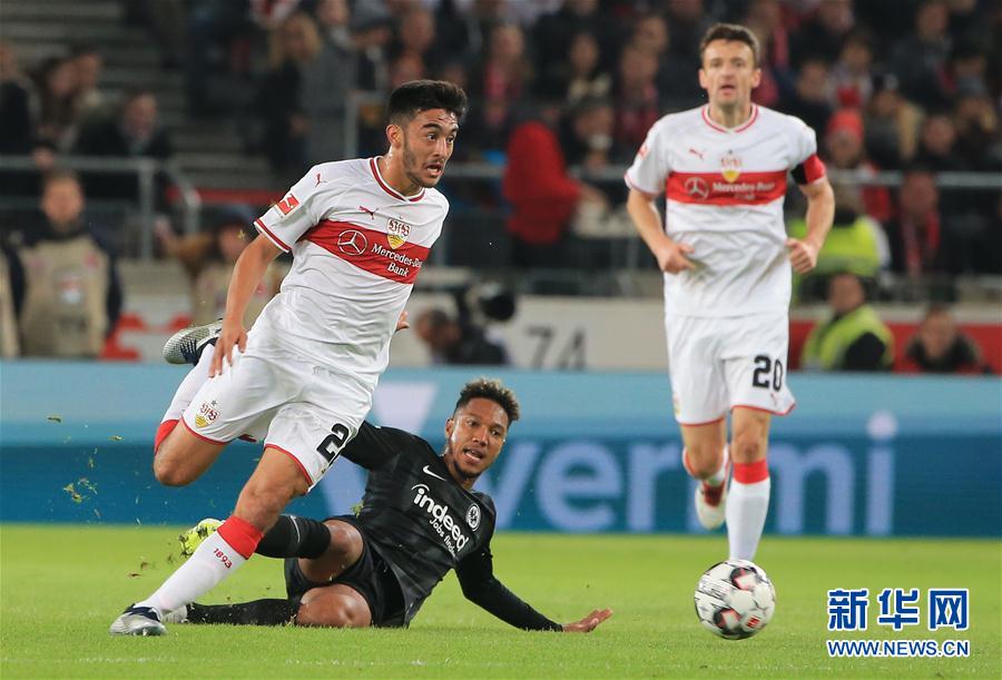 11月2日,斯图加特队球员冈萨雷斯(左)在比赛中带球突破法兰克福队球员德古兹曼(下)的防守。 当日,在2018-2019赛季德国足球甲级联赛第10轮比赛中,斯图加特队主场以0比3不敌法兰克福队。 新华社发(菲利普·鲁伊兹摄)