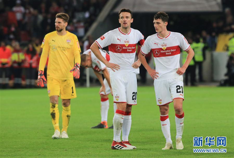 11月2日,斯图加特队球员帕瓦尔(右)、根特纳(中)和守门员齐勒在比赛后情绪低落。新华社发(菲利普·鲁伊兹摄)