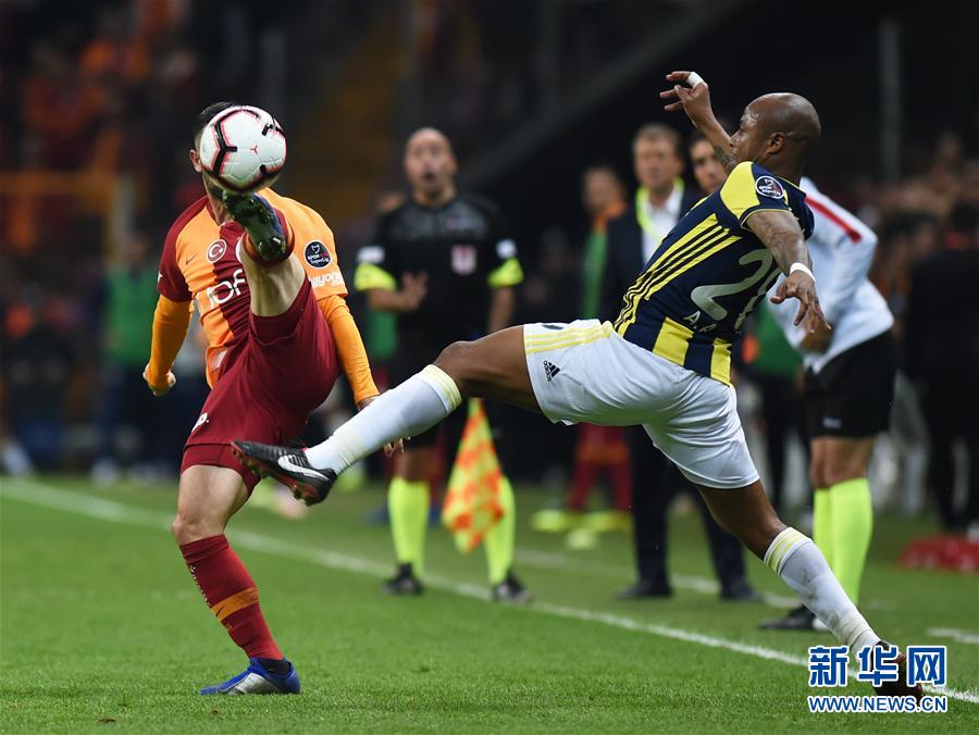 11月2日,加拉塔萨雷队球员巴伊拉姆(左)和费内巴切队球员阿尤在比赛中拼抢。 当日,在2018-2019赛季土耳其足球超级联赛第11轮比赛中,加拉塔萨雷队主场以2比2战平费内巴切队。 新华社记者贺灿铃摄