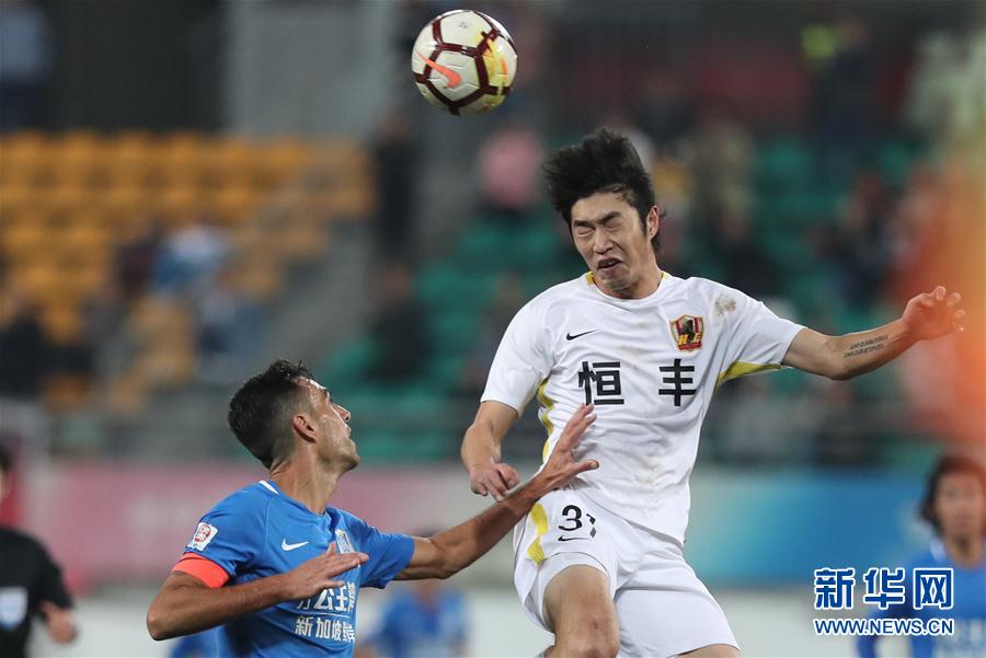 11月2日,贵州恒丰队球员赵和靖(右)在比赛中争顶。 当日,在2018赛季中超联赛第28轮比赛中,广州富力队客场以2比0战胜贵州恒丰队。 新华社记者刘续摄