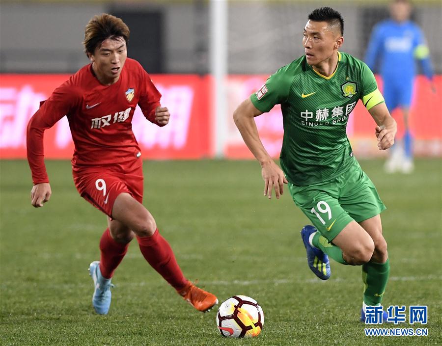 11月2日,北京中赫国安队球员于大宝(右)与天津权健队球员杨旭在比赛中拼抢。 当日,在2018赛季中超联赛第28轮比赛中,北京中赫国安队客场以0比0战平天津权健队。 新华社记者岳月伟摄