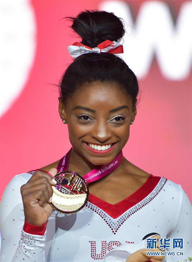 11月2日,拜尔斯在颁奖台上。当日,在多哈进行的第48届体操世锦赛女子跳马决赛中,美国选手拜尔斯以15.366分夺得冠军。 新华社发(尼库摄)